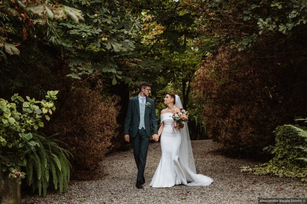 Sposo Gino Baudino verde bosco: Andrea sceglie un bellissimo abito slim fit verde bosco per il suo matrimonio, impreziosito da gilet e plastron abbinati sul tono del perla/verde salvia.